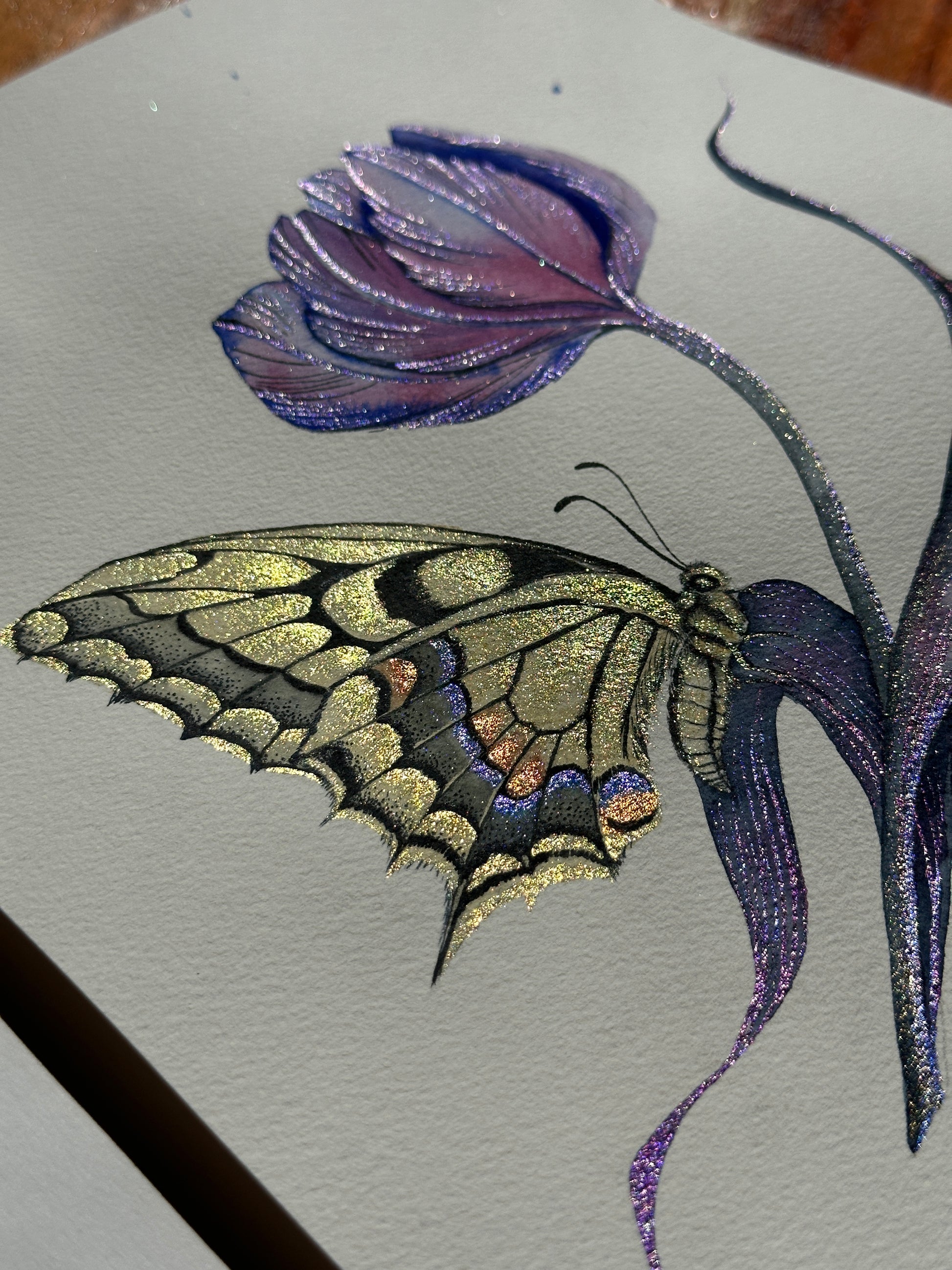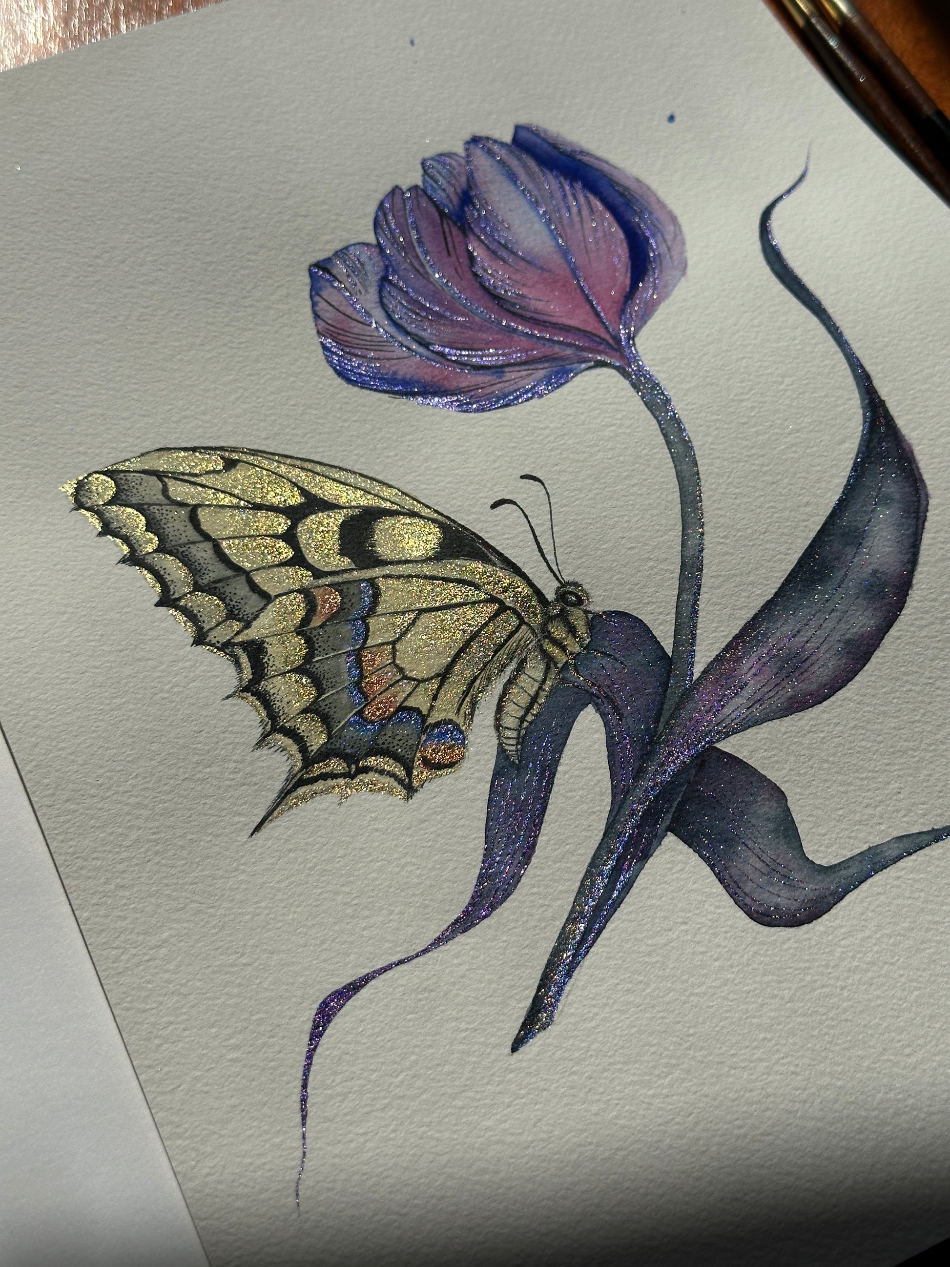 The piece captures a quiet, delicate moment between flower and butterfly, where color, movement, and shimmer come together. Each detail is carefully painted to preserve the natural brilliance and elegance of metallic watercolor.