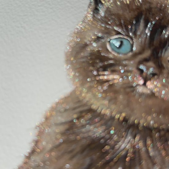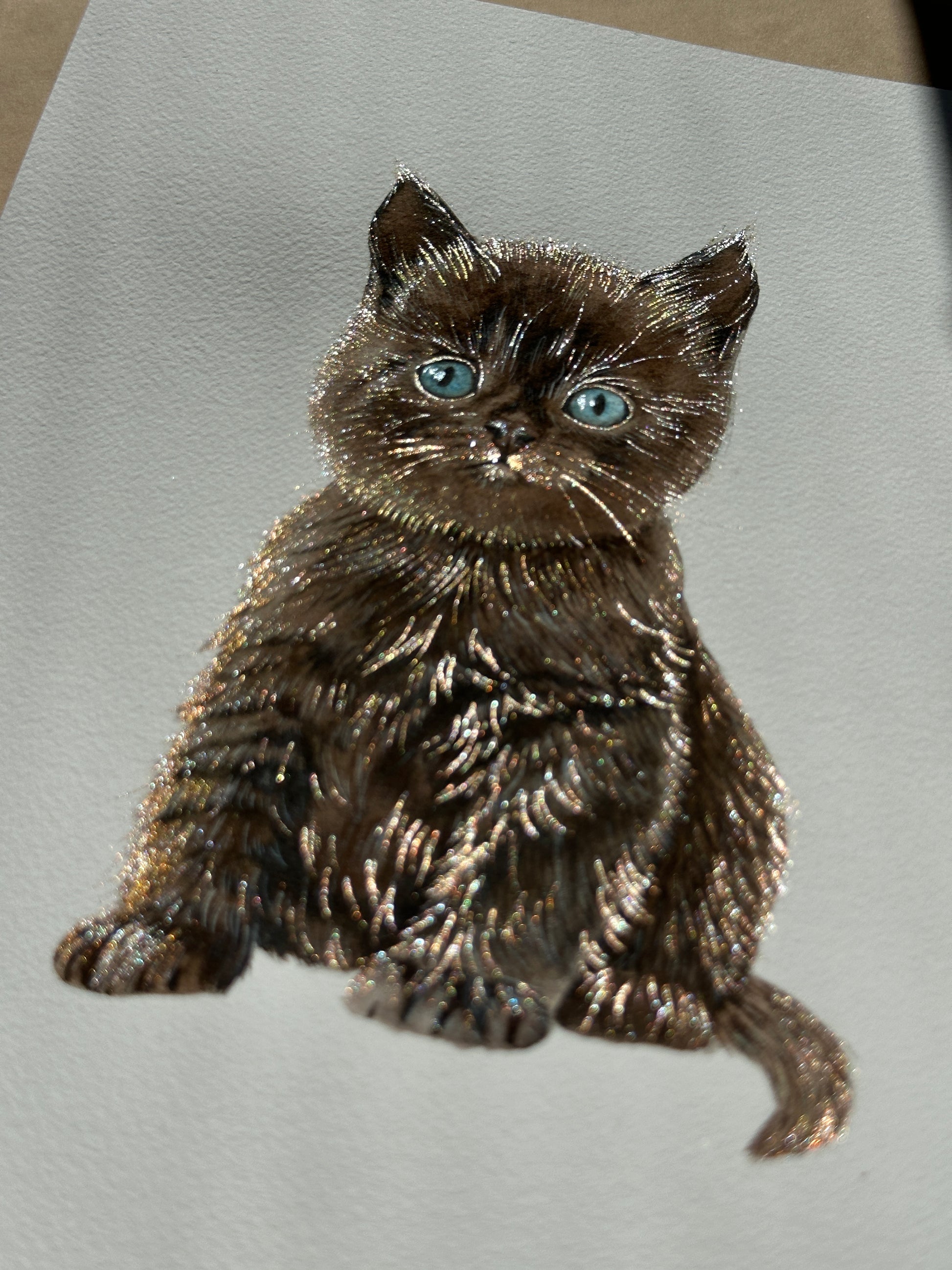 Blue-Eyed Kitten is an original watercolor painting capturing the gentle charm of a brown kitten with striking blue eyes. Painted with meticulous care, the piece highlights the delicate fur textures and the kitten’s expressive gaze.