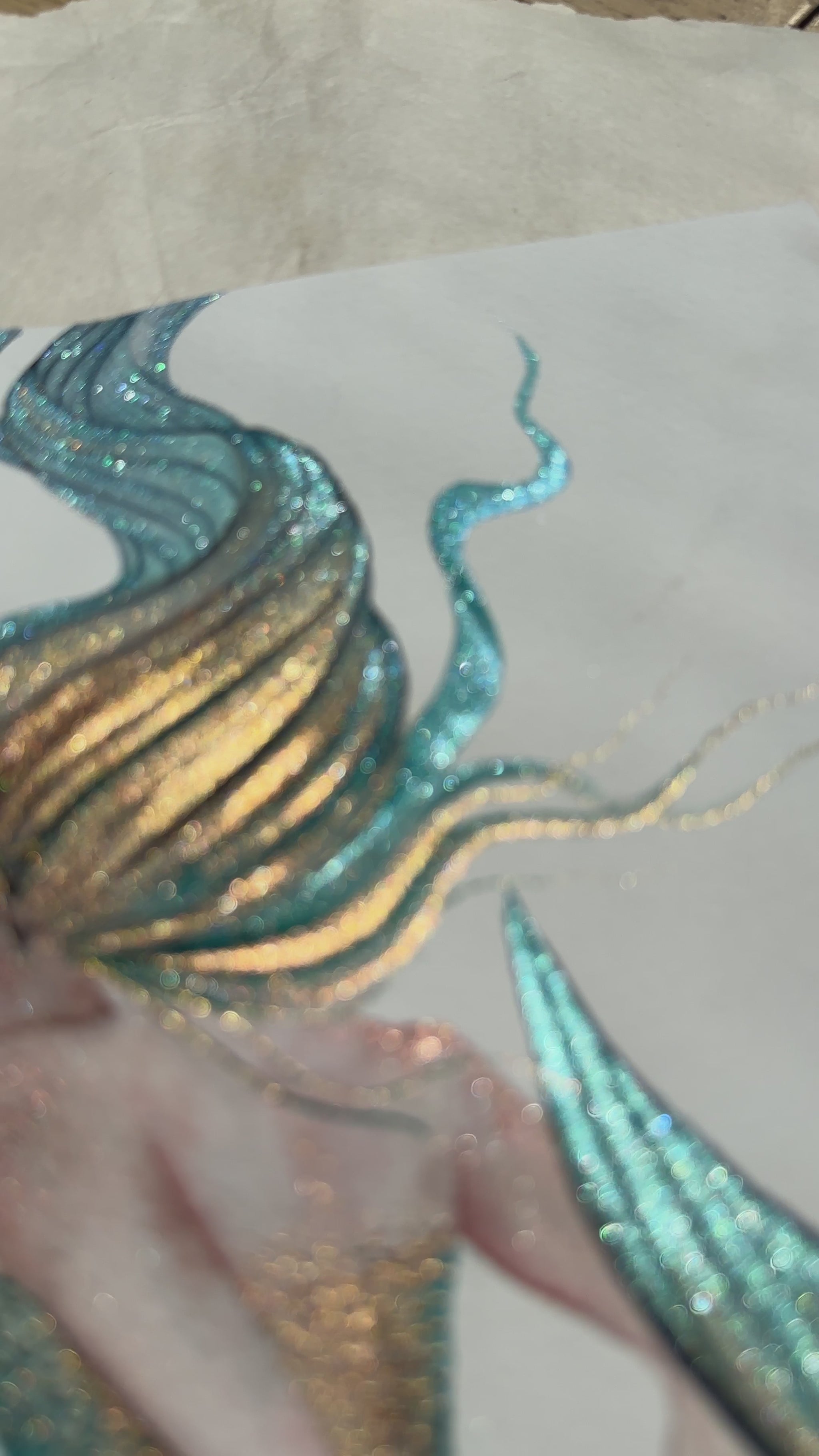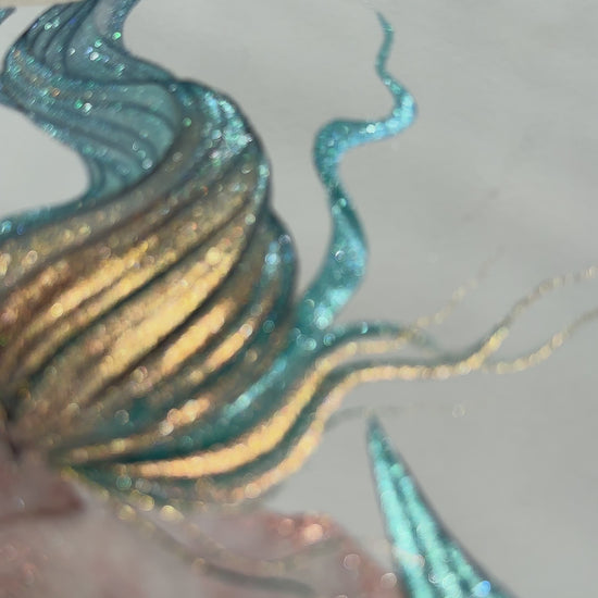 Dive into a world of magic with this radiant mermaid, adorned with shimmering golden and blue scales that catch the light like the waves of the sea. Her flowing hair mirrors the same luminous hues, creating a mesmerizing harmony of color and movement. Every detail is captured with care, making this artwork a stunning centerpiece for any collection.