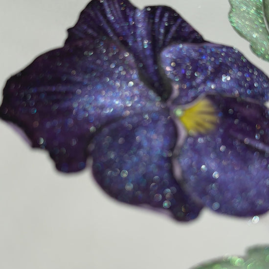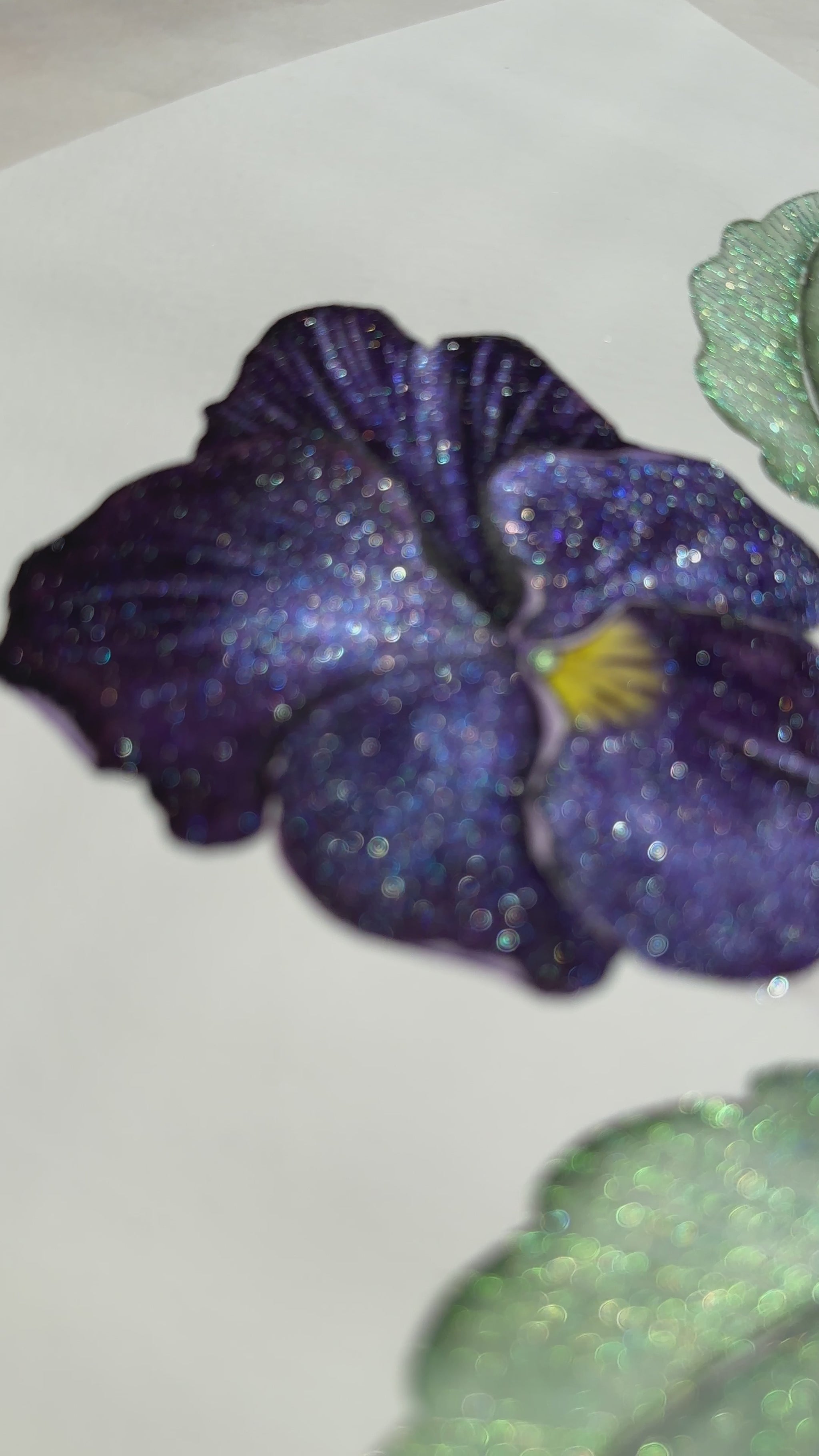 Midnight Pansy Glow reveals the quiet beauty of a pansy illuminated in darkness. Painted with layered metallic watercolors, the petals reflect light with a subtle, velvety shimmer, creating depth and a soft inner glow. Deep tones and luminous highlights come together to evoke the calm elegance of night.