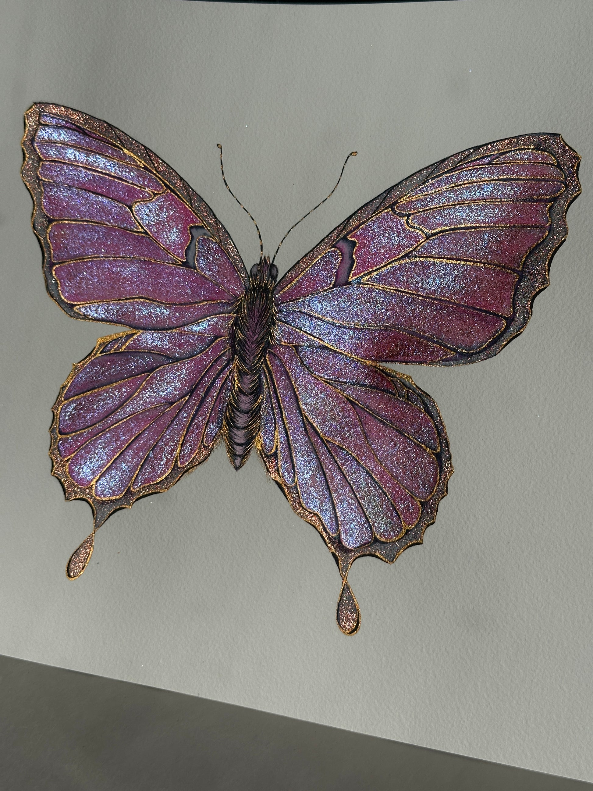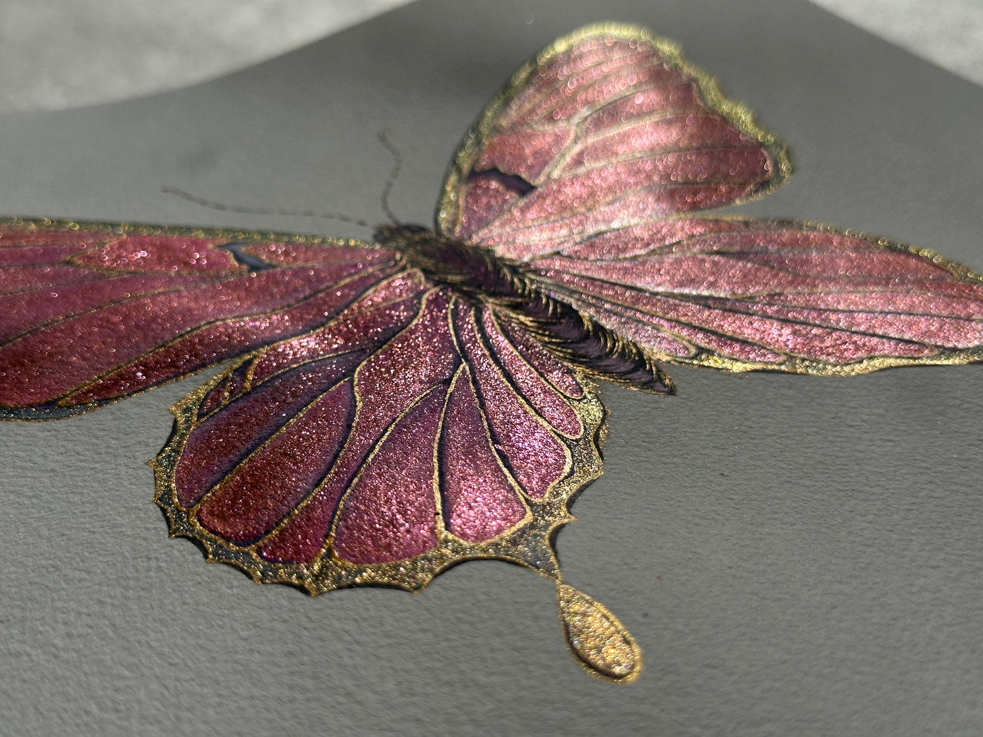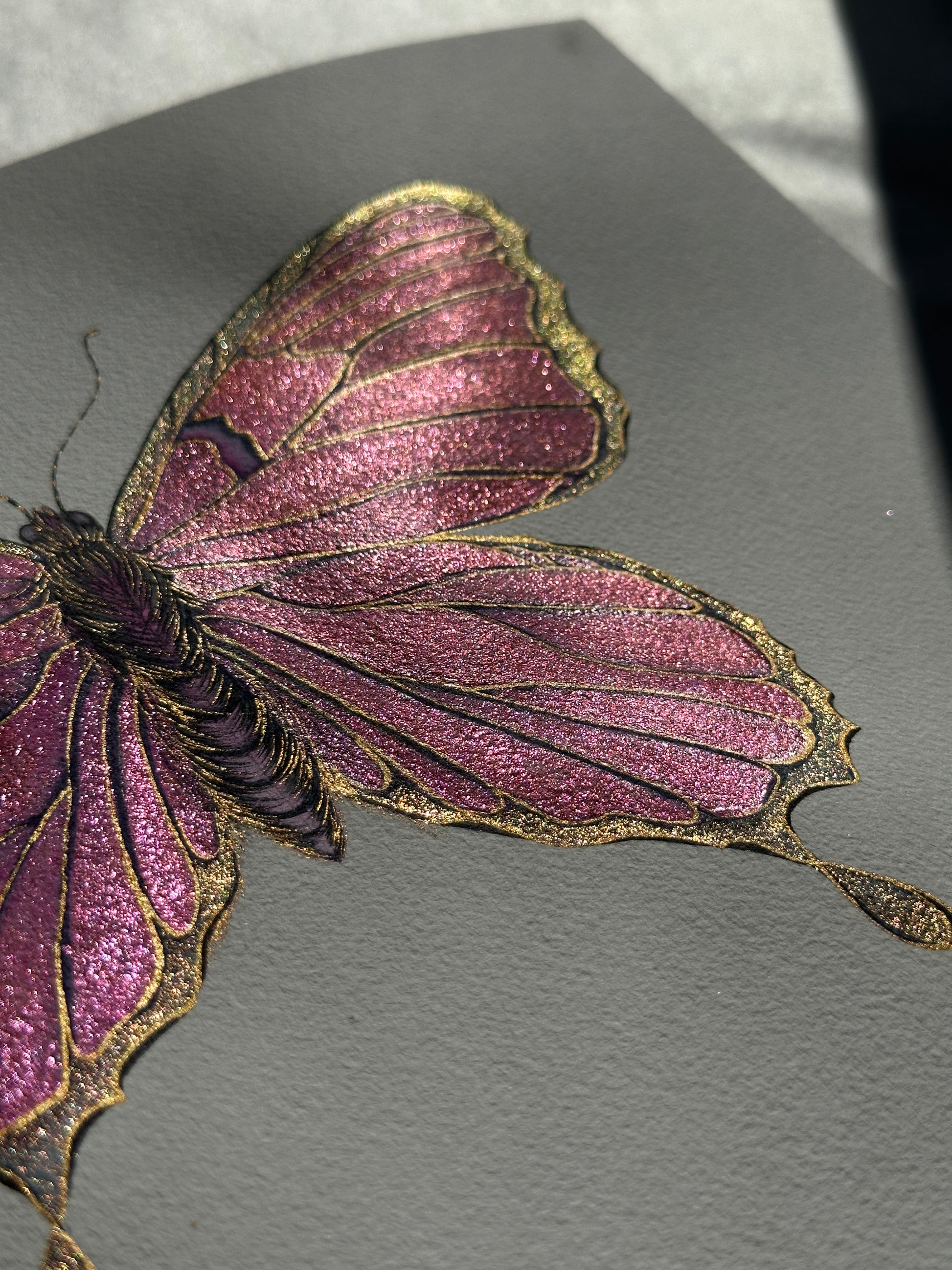 A dazzling pink butterfly captured in vivid detail. This artwork is now sold.