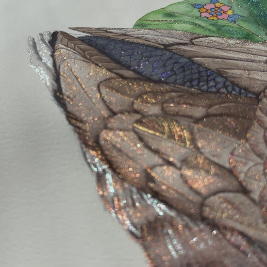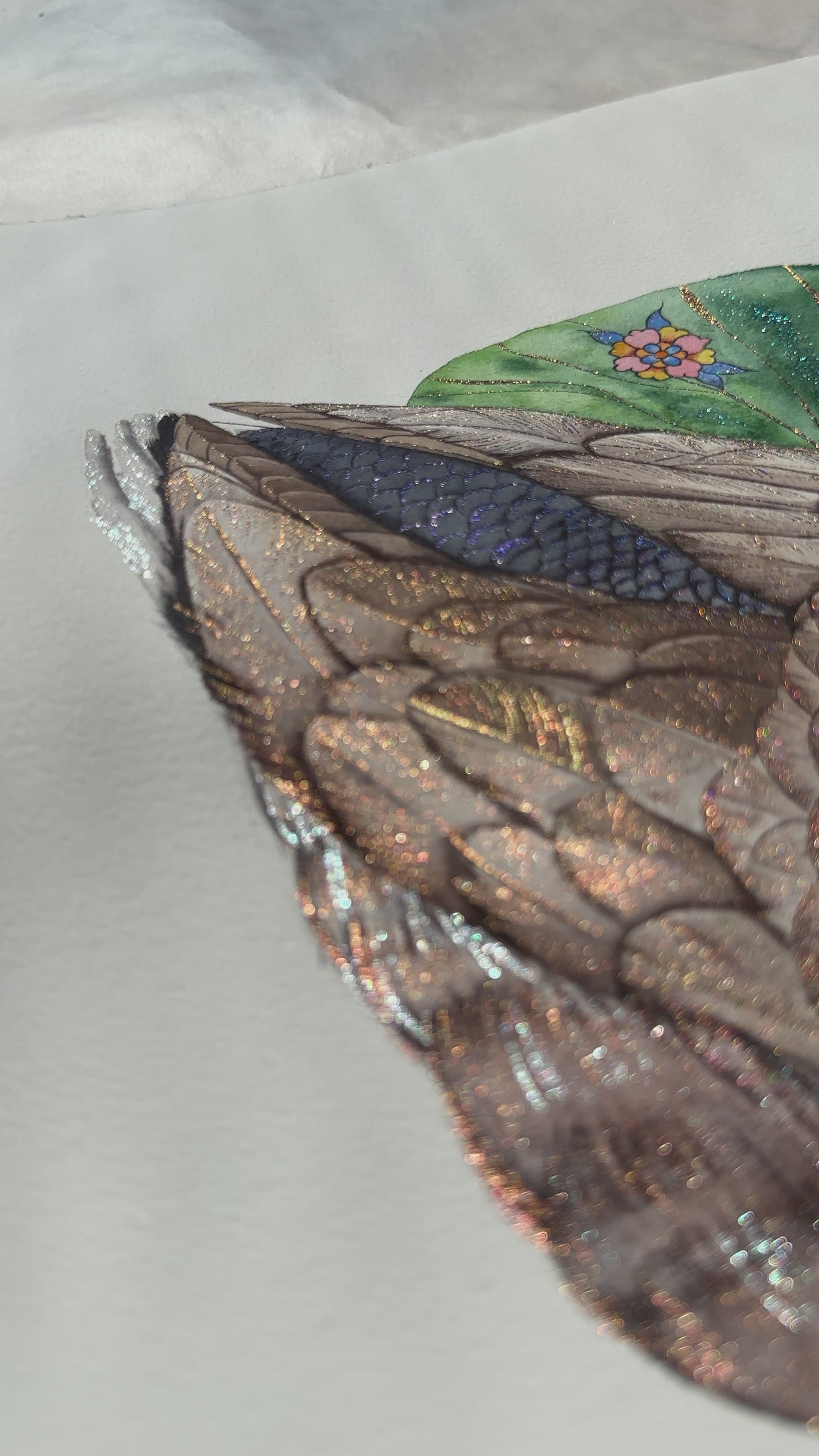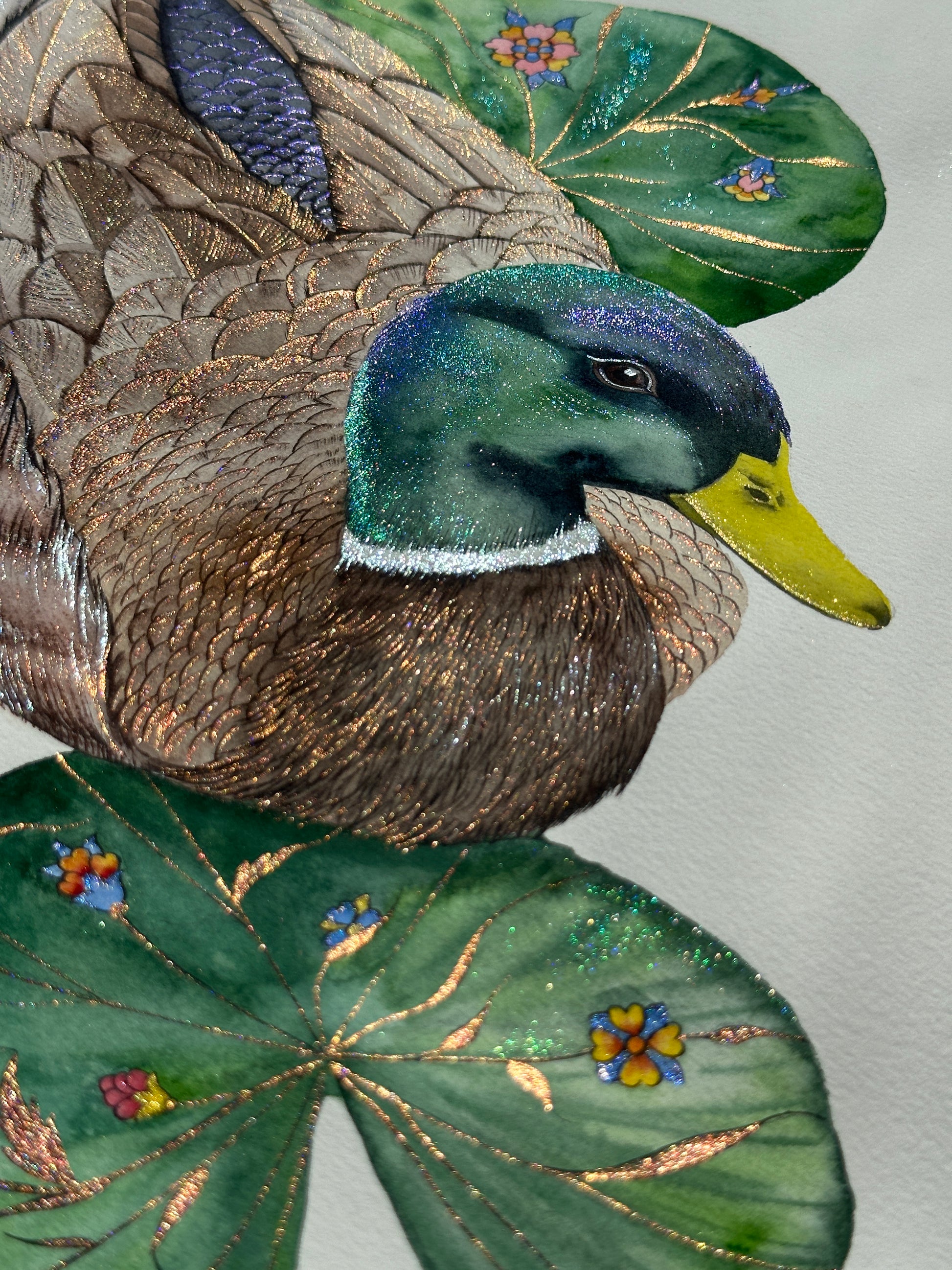 This original artwork captures a radiant mallard duck in stunning detail. Each feather is brought to life with vibrant, shimmering colours, creating a realistic three-dimensional effect. Painted with my shimmering metallic touch, this piece highlights the natural beauty and elegance of the mallard, making it a striking addition to any collection or space